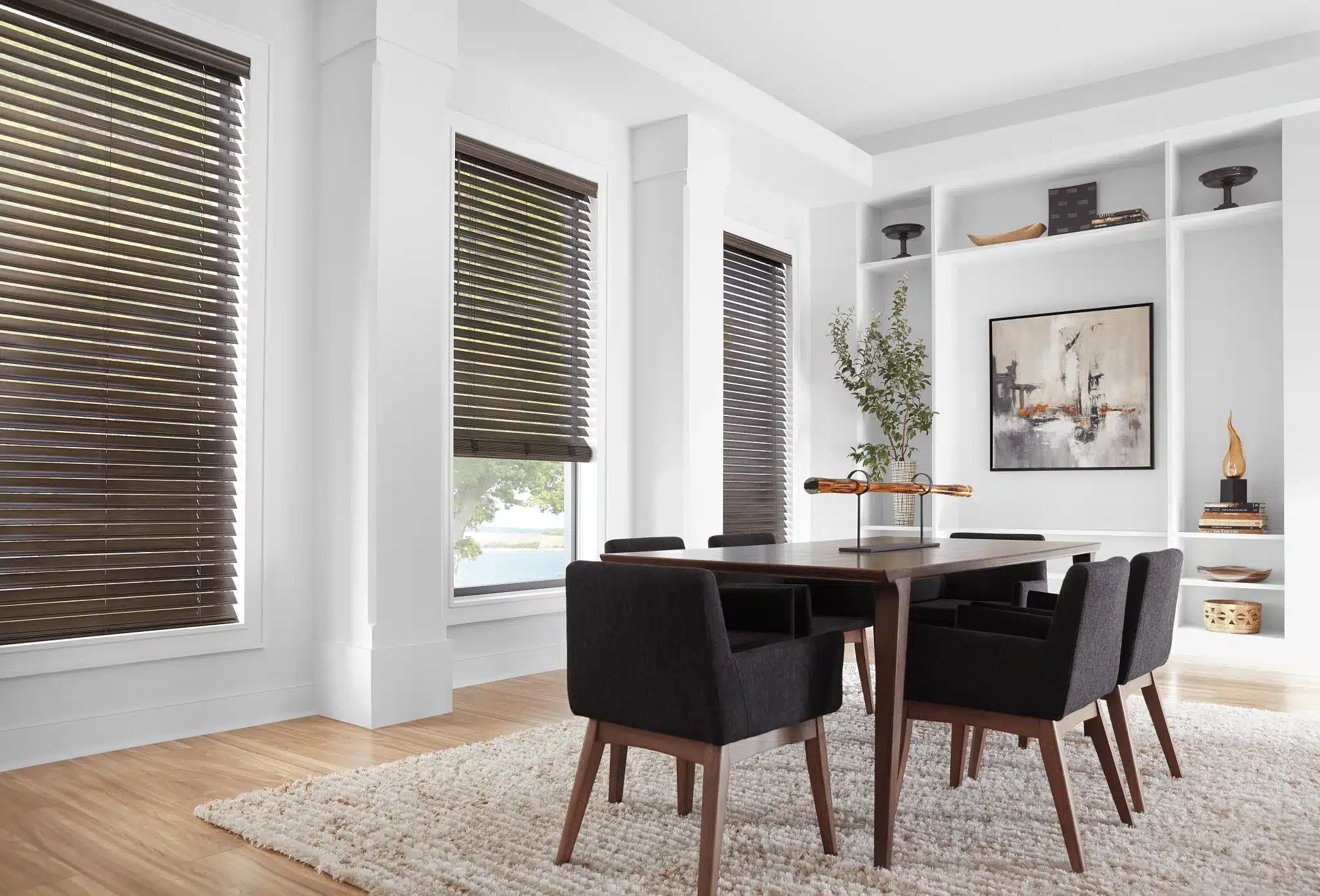 Faux wood blinds are a great window treatment for any room because they look like real wood blinds but are more durable. They won’t get damaged by heat or humidity. They are an ideal solution for spaces that experience high moisture, such as kitchens and bathrooms, while adding a touch of sophistication to living areas and bedrooms.
